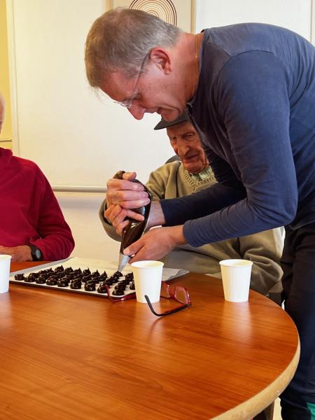 Très curieux et impliqués, les résidents ont posé de nombreuses questions sur les différentes étapes de confection : de la transformation du cacao jusqu’au travail du chocolat, en passant par les techniques de préparation des truffes. Cet échange riche a permis à chacun de mieux comprendre ce produit qu’ils apprécient tant.